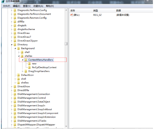 1、打开注册表管理器,找到HKEY_CLASSES_ROOT\Directory\Background\Shellex\ContextMenuHandlers