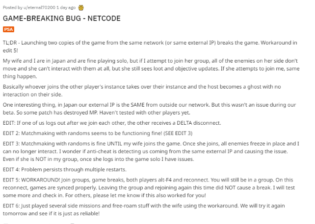 “随机匹配机制下游戏运行良好!直到我的妻子加入我的小队之前游戏都是很正常的,而一旦她加入之后,我这边所有的敌人都不动了,我也无法再与之互动。我猜想是否是因为反作弊系统检测到了我们是来自同一个外部IP才会出现这样的问题,但是有一次当她不在我的小队之中,仅仅只是单人进入游戏之时我这边就又出现了问题。”