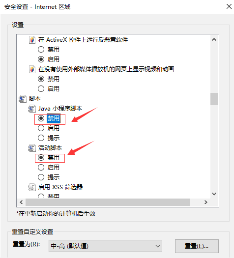 3.拖动滚动条,将“java小程序脚本”和“活动脚本”勾选为“禁用”,点击“确定”按钮保存退出。