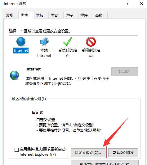 2.在打开的Internet属性界面在安全选项卡下,点击“自定义级别(C)…”进入下一步操作;