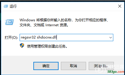 2、然后我们还要执行另一个:运行窗口中,执行regsvr32 shdocvw.dll命令;